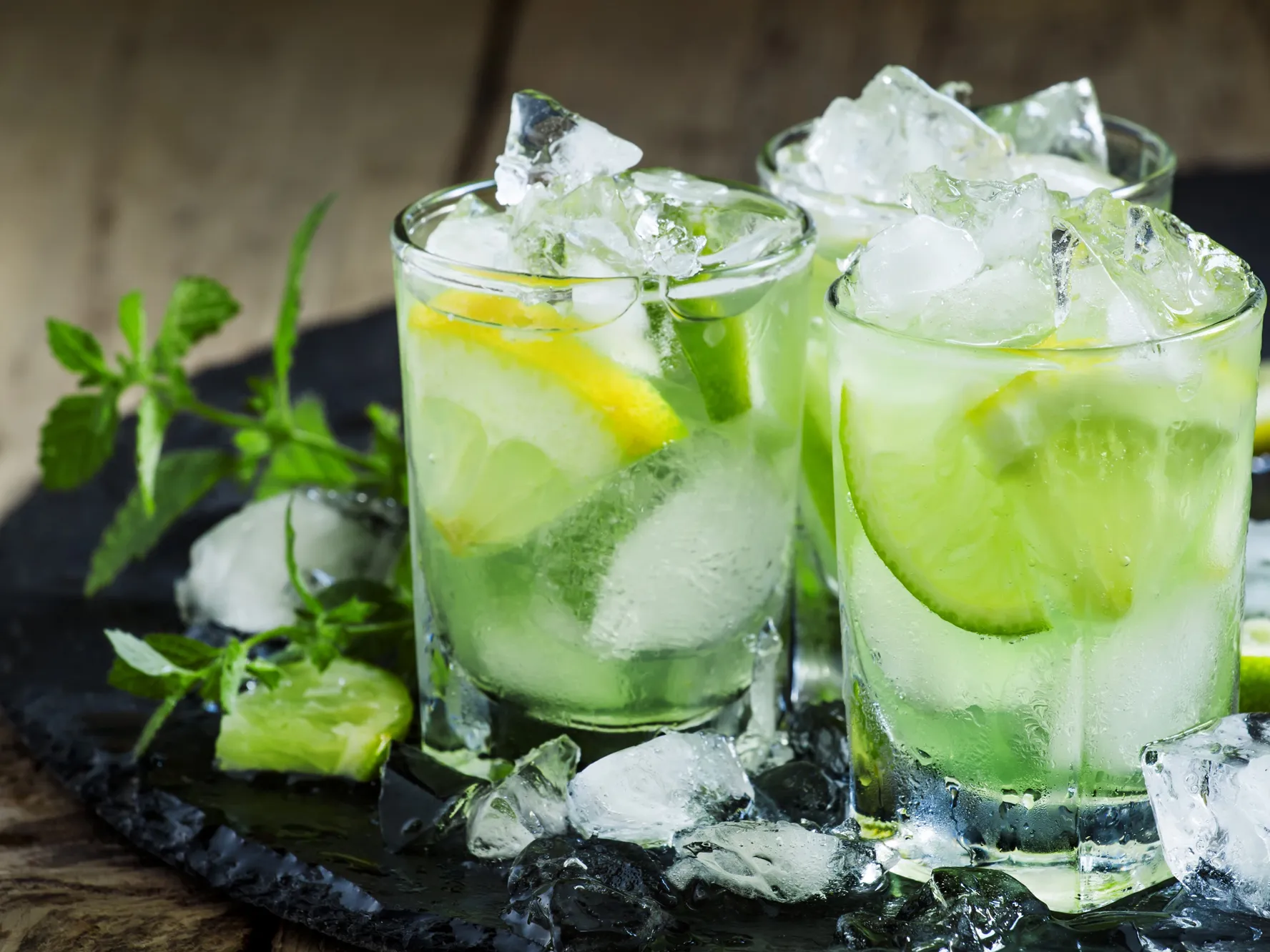 Double white rum, lime, simple syrup, mint leaves, soda water